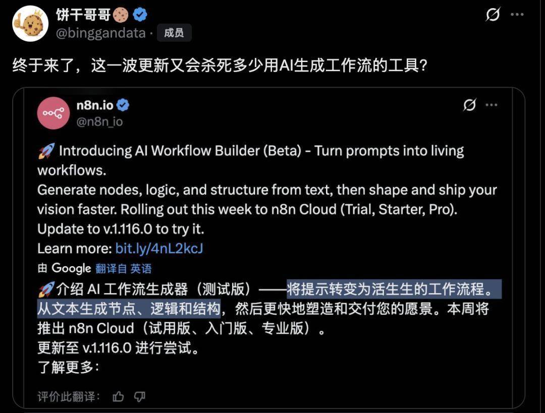 还有一个更劲爆的消息就是n8n官方下场做这种 AI生成工作流了,很快我们就能在n8n里完成自动工作流的生成。