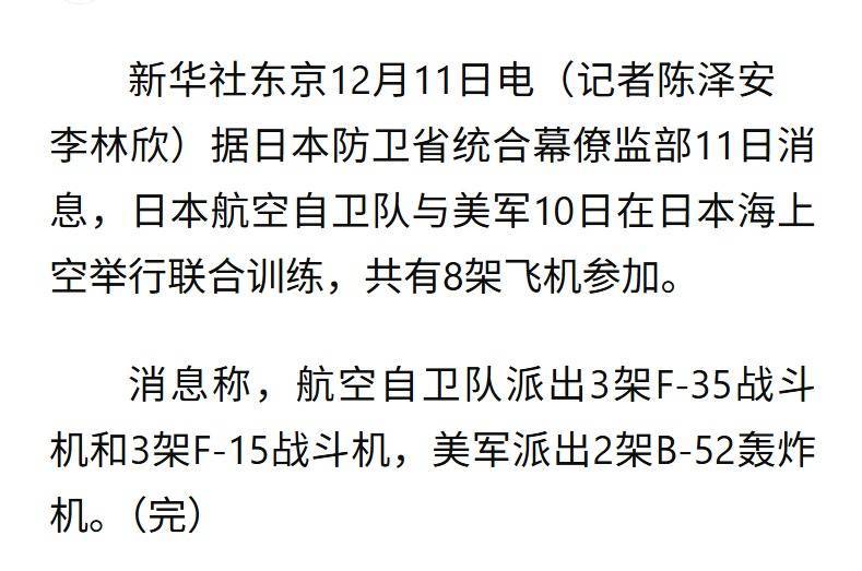 消息称,航空自卫队派出3架F-35战斗机和3架F-15战斗机,美军派出2架B-52轰炸机。